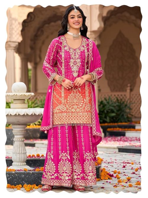INDO ERA Women’s Silk Blend Embroidered Straight Kurta & Palazzo with Dupatta Set